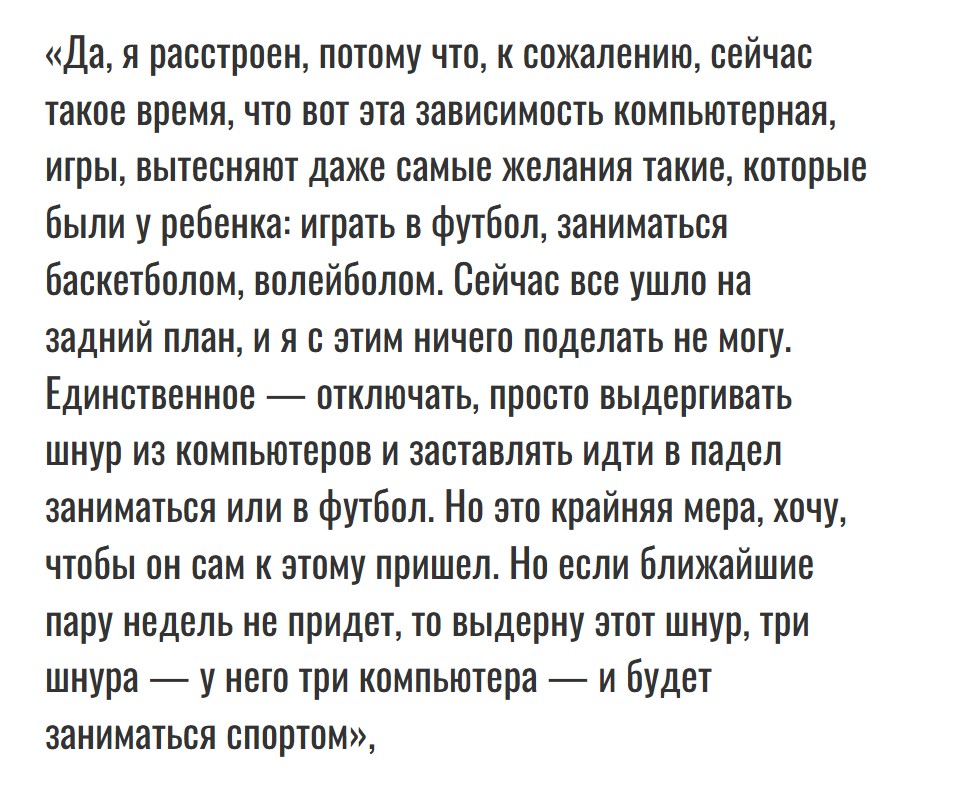 Артист отмечает, что сын стал меньше интересоваться учёбой и прежними увлечениями. Сейчас большую часть времени он проводит за компьютером.
