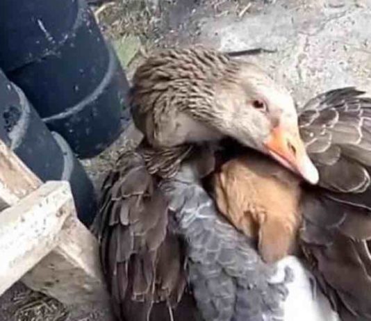 Гусь обнимает на улице пса, чтобы согреть его. Душещипательная картина!