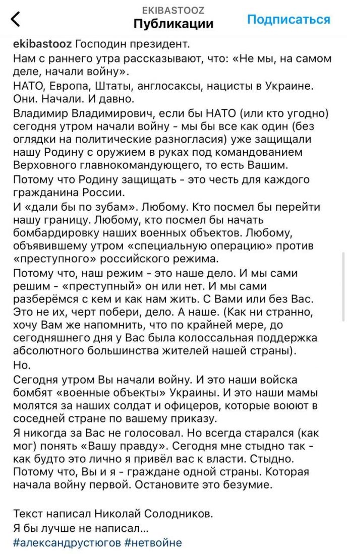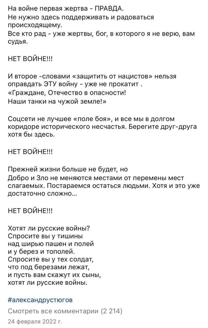 Александр Устюгов открыто высказался о происходящем, опубликовав эмоциональный пост на своей странице. Актёр раскритиковал действия властей РФ и дал понять, что не поддерживает происходящее. В обращении он прямо заявил: «Это не мой конфликт», подчеркнув, что не намерен оставаться в стороне и делать вид, будто ничего не происходит.