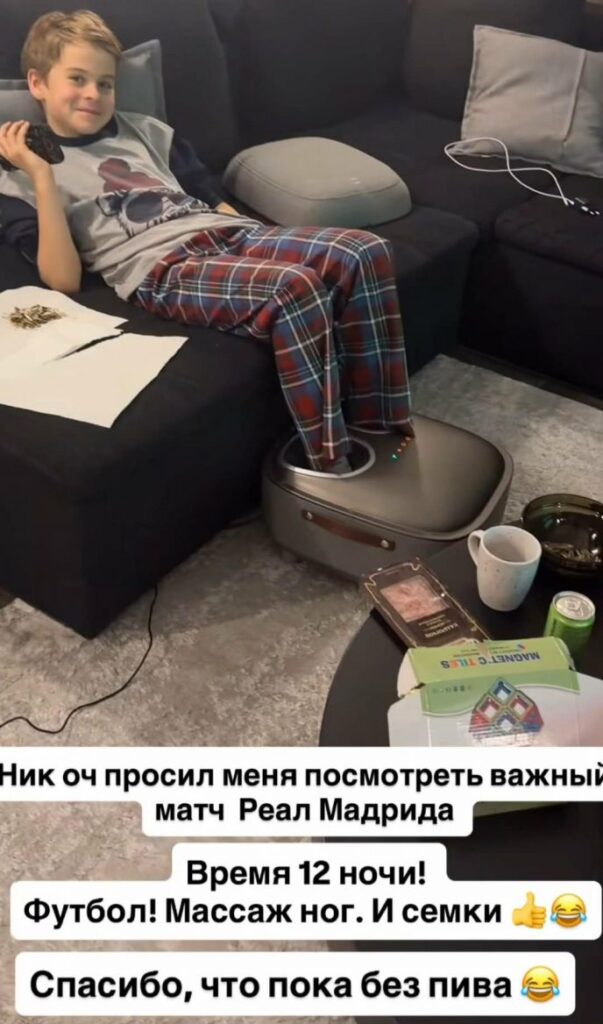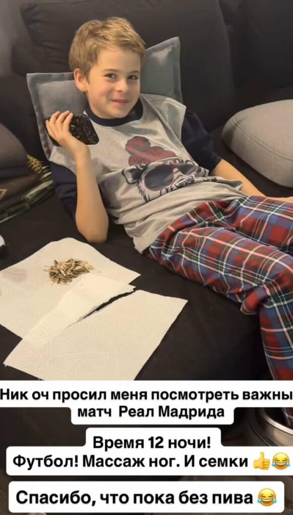С. Лазарев поделился редкими домашними кадрами. На видео его 11-летний сын расслабляется перед телевизором — поздний вечер, футбол, семечки и шуточный массаж ног от звёздного папы. Чуть позже артист опубликовал и снимок 7-летней дочери, нежно подписав его коротко и по-отцовски тепло.