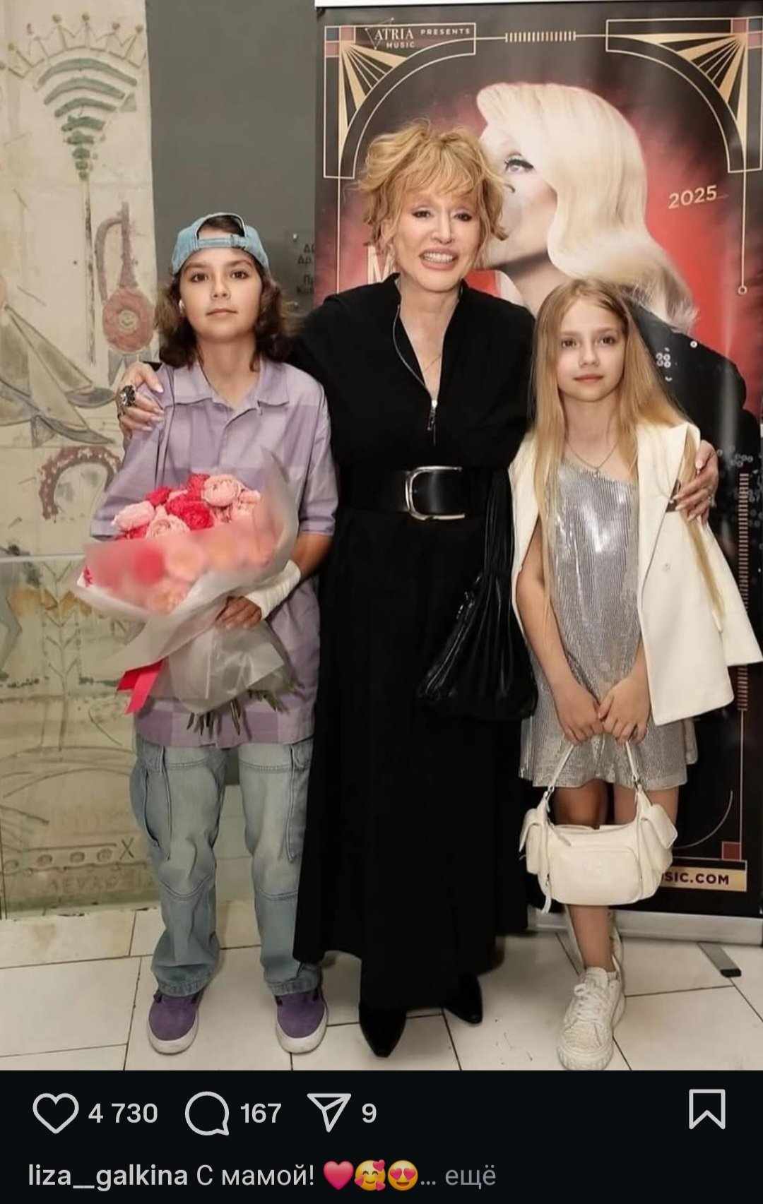 Дочь Пугачевой и Галкина обнародовала фото с мамой и братом, подписав снимок лаконично: “С мамой”. Ранее журналисты акцентировали свое внимание на том, что двойняшки редко показывают свои чувства на людях и практически никогда не называют Аллу Борисовну “мамой”.